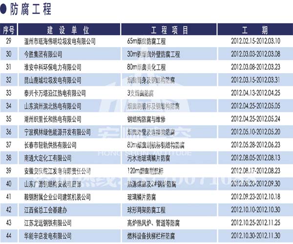 宏順建設工程有限公司是國家批準成立的專業高空作業企業:承攬過(國內.國外)煙囪新建、煙囪防腐、吊機防腐、水塔防腐、管道防腐、龍門吊防腐、儲存罐防腐、煙囪內壁防腐等高空作業工程。具有“不搭腳手架 、 不需要停產”施工特點。